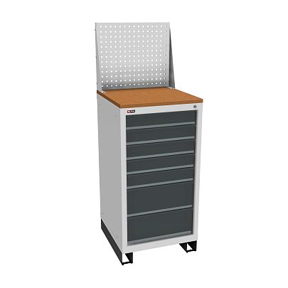 Корпус тумбы и ящиков сварной, что обеспечивает высокую жесткость. Сверху установлены столешница и экран с комплектом упоров. Тумба стоит на подставке.