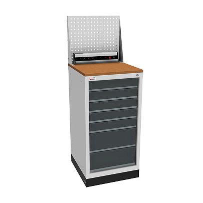 Корпус тумбы и ящиков сварной, что обеспечивает высокую жесткость. Сверху установлена столешница, экран с комплектом упоров и электропанель. Тумба стоит на подставке с цоколем.