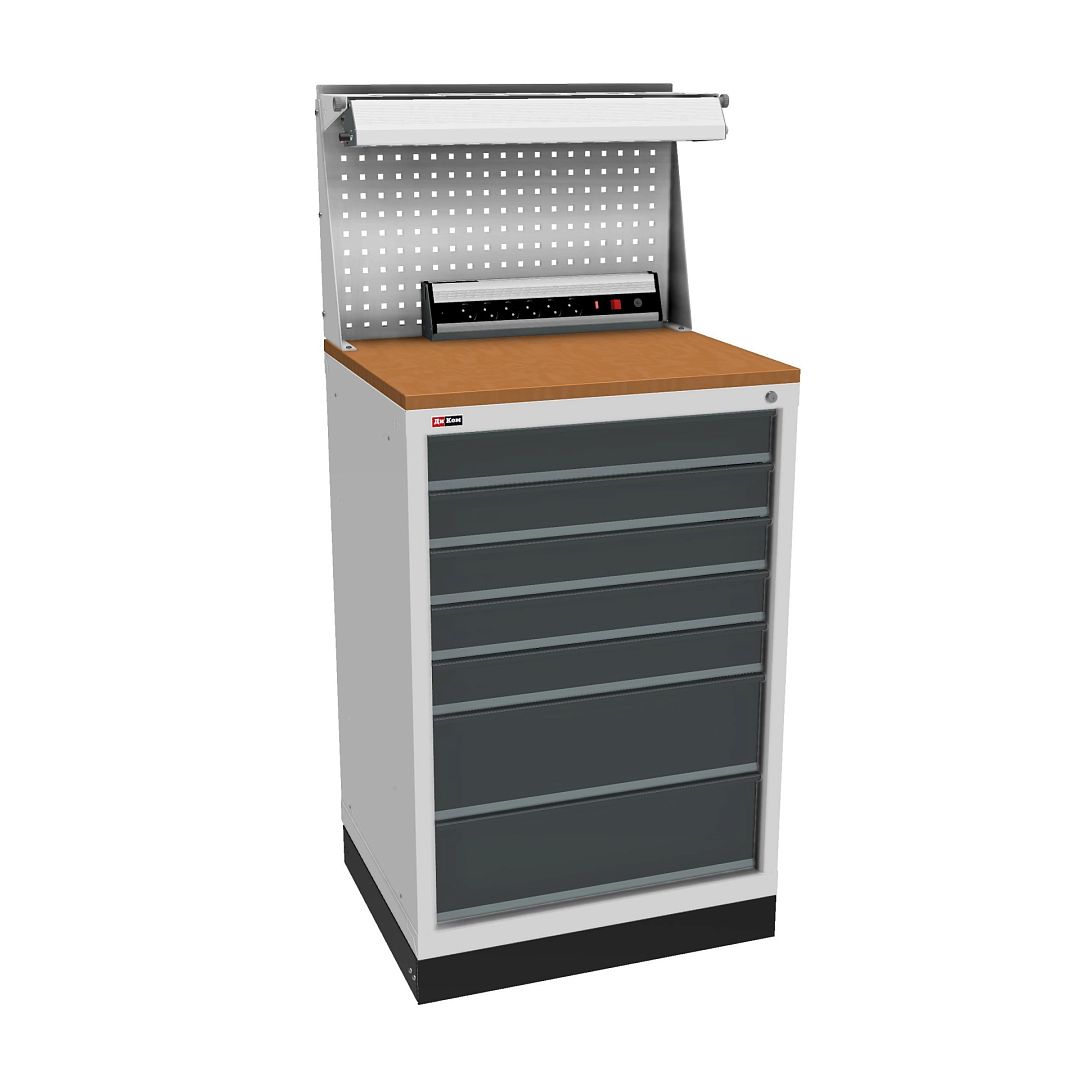 Тумба используется как рабочее место - сверху установлена столешница, экран, комплект упоров, кронштейн, светильники и электропанель. Тумба стоит на подставке с цоколем.