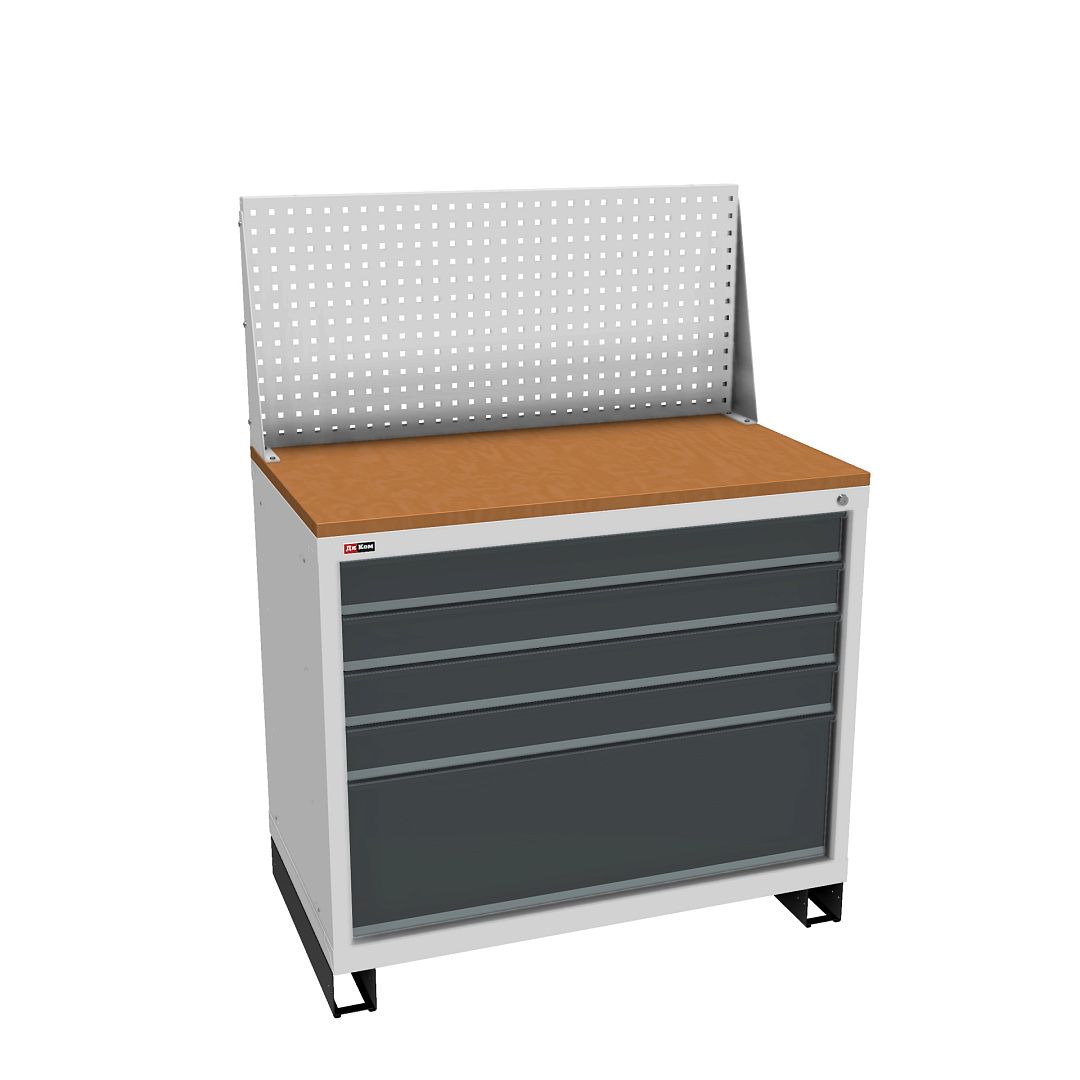 Корпус тумбы и ящиков сварной, что обеспечивает высокую жесткость. Сверху установлена столешница, экран и комплект упоров. Тумба стоит на подставке.