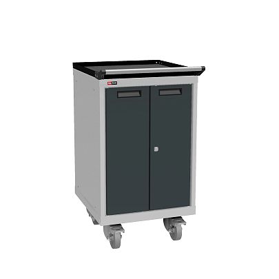Тумба с распашными дверцами на колёсах для перемещения различных грузов / инструментов. Максимальная нагрузка на колёса — 2000 кг (статическая) / 1000 кг (динамическая). Максимальная нагрузка на полку — 200 кг.