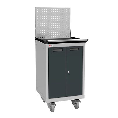 Тумба с распашными дверцами на колёсах для перемещения различных грузов / инструментов. Максимальная нагрузка на колёса — 2000 кг (статическая) / 1000 кг (динамическая). Максимальная нагрузка на полку — 200 кг.