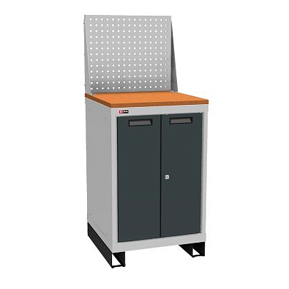 Используется как рабочее место. Сверху установлена столешница из влагостойкой фанеры и экран перфорированный с комплектом упоров. Тумба стоит на подставке. Удобна для перемещения рохлей.