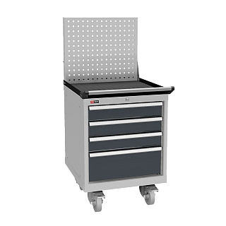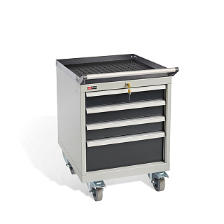 Корпус тумбы и ящиков сварной, что обеспечивает высокую надёжность в использовании. Сверху установлен лоток с резиновым ковриком. Ручка на лоток для перемещения.