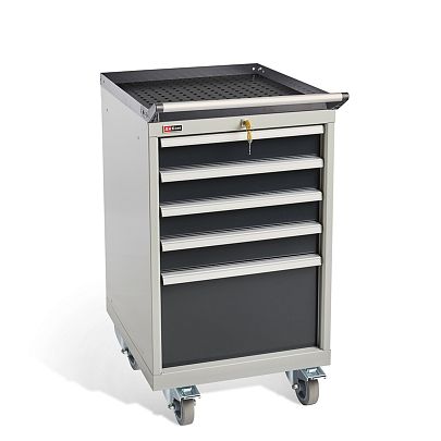 Корпус тумбы и ящиков сварной, что обеспечивает высокую надёжность в использовании. Сверху установлен лоток с резиновым ковриком. Ручка на лоток для перемещения.