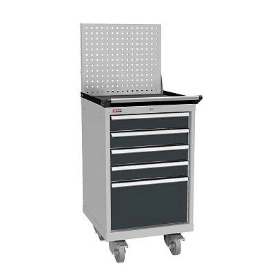 Корпус тумбы и ящиков сварной, что обеспечивает высокую надёжность в использовании. Сверху установлен лоток с резиновым ковриком и экран перфорированный для аксессуаров и держателей инструмента. Ручка на лоток для перемещения.