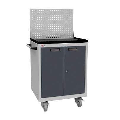Корпус тумбы сварной, что обеспечивает высокую надёжность в использовании. Сверху установлен лоток с резиновым ковриком и экран перфорированный для аксессуаров и держателей инструмента. Ручка боковая для перемещения.