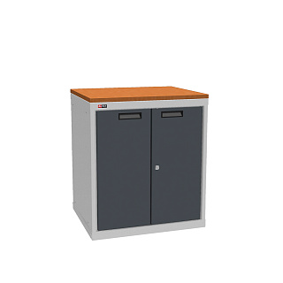 Тумба для хранения оснастки, инструмента и материалов на производственных предприятиях, может использоваться как рабочее место. Сверху установлена столешница из влагостойкой фанеры.