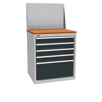 Используется как рабочее место. Сверху установлена столешница из влагостойкой фанеры и экран перфорированный с комплектом упоров для навески аксессуаров и держателей инструмента.