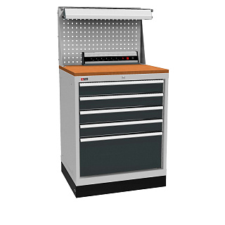 Используется как рабочее место. Сверху установлена столешница, экран с комплектом упоров, кронштейн со светодиодным светильником и электропанель. Тумба стоит на подставке с цоколем. Удобна для перемещения рохлей.