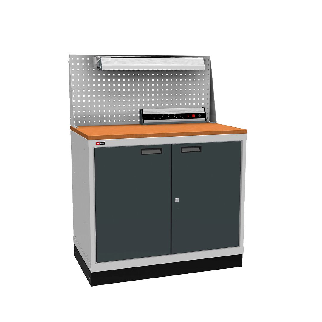 Используется как рабочее место. Сверху установлена столешница, экран с комплектом упоров, кронштейн со светодиодным светильником и электропанель. Тумба стоит на подставке с цоколем. Удобна для перемещения рохлей.