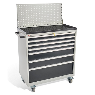 Тумба с ящиками на колёсах для перемещения различных грузов / инструментов. Максимальная нагрузка на колёса — 2000 кг (статическая) / 1000 кг (динамическая). Максимальная нагрузка на ящик — 100 кг. Корпус тумбы и ящиков сварной, что обеспечивает высокую надёжность в использовании. Сверху установлен лоток с резиновым ковриком и экран перфорированный для аксессуаров и держателей инструмента. Ручка боковая для перемещения.