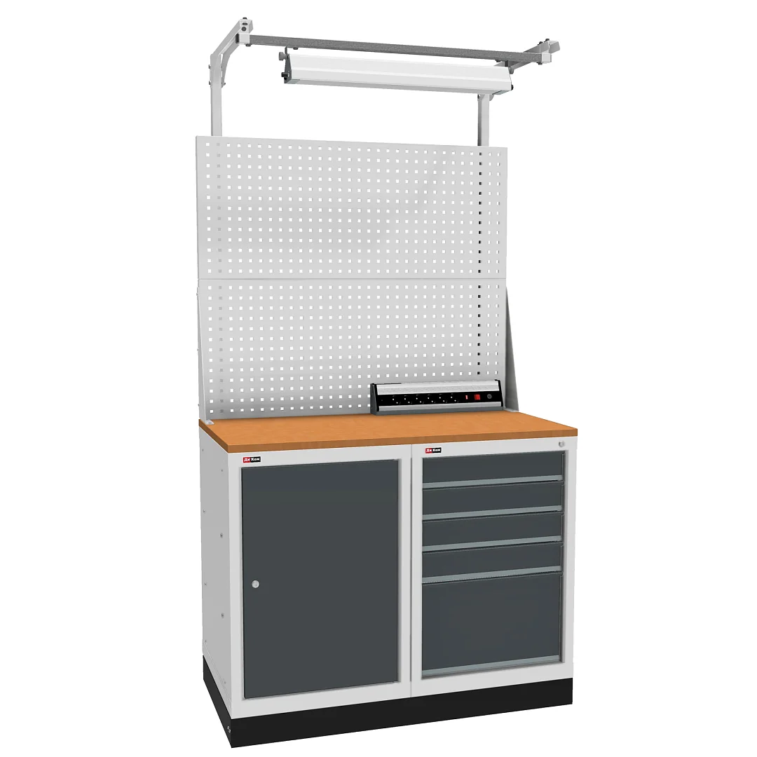 Корпуса тумб сварные, что обеспечивает высокую жесткость. Сверху установлена общая столешница, высокий экран со светодиодным светильником, а также электропанель. Тумбы стоят на подставках с цоколями.
