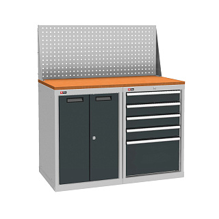 Корпуса тумб и ящиков сварные, что обеспечивает высокую жесткость и надёжность. Сверху установлена общая столешница и перфорированный экран.