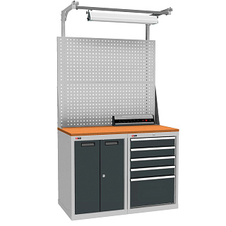Корпуса тумб и ящиков сварные, что обеспечивает высокую жесткость и надёжность. Сверху установлена общая столешница, высокий экран со светодиодным светильником, а также электропанель.