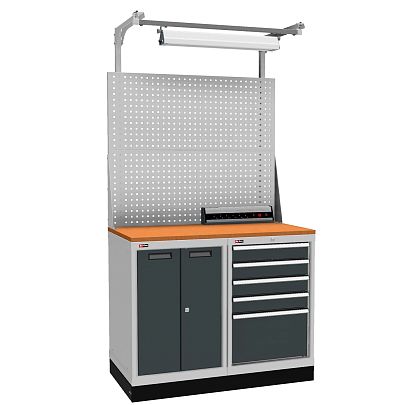Корпуса тумб и ящиков сварные, что обеспечивает высокую жесткость и надёжность. Сверху установлена общая столешница, высокий экран со светодиодным светильником, а также электропанель. Тумбы стоят на подставках с цоколями.