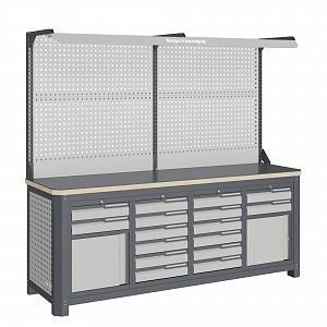 Экран (перфорированная панель) верстака выполнен с квадратной перфорацией 12х12 мм с шагом 38 мм для установки крючков, держателей и других аксессуаров. Экран крепятся к столешнице с помощью специальных кронштейнов. Максимальная масса груза, равномерно распределенного по поверхности экрана, составляет 71 кг.