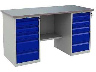 Верстак состоит из 2 тумб WD5. Тумба укомплектована 5-ю выдвижными ящиками. Ящики открываются на телескопических направляющих. Нагрузка на ящик 30 кг. Все ящики закрываются на центральный ключевой замок.