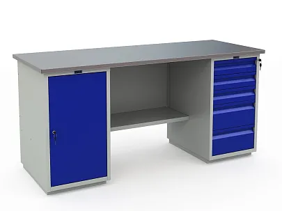 Верстак окрашен порошковой краской, цвет покрытия корпуса серый шагрень (RAL 7038), лицевая панель дверцы тумбы – синий шагрень (RAL 5002)