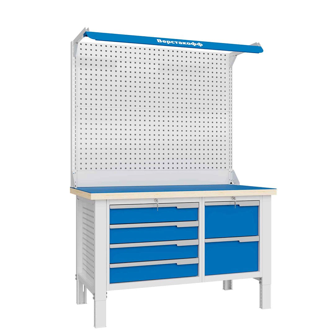 Регулировка рабочего места по высоте осуществляется в диапазоне от 700 до 950мм с шагом 25мм. Предусмотрена возможность тонкой регулировки усиленным резьбовым подпятником. Нагрузка на ящики верстака - до 40 кг, на полки - до 60кг. Общая распределенная нагрузка на рабочую поверхность 1500кг. Имеет возможность стыковки в единую рабочую поверхность с верстаками серии Constructor