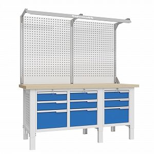 Регулировка рабочего места по высоте осуществляется в диапазоне от 700 до 950мм с шагом 25мм. Предусмотрена возможность тонкой регулировки усиленным резьбовым подпятником. Нагрузка на ящики верстака - до 40 кг, на полки - до 60кг. Общая распределенная нагрузка на рабочую поверхность 1500кг. Имеет возможность стыковки в единую рабочую поверхность с верстаками серии Constructor