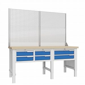 Регулировка рабочего места по высоте осуществляется в диапазоне от 700 до 950мм с шагом 25мм. Предусмотрена возможность тонкой регулировки усиленным резьбовым подпятником. Нагрузка на ящики верстака - до 40 кг, на полки - до 60кг. Общая распределенная нагрузка на рабочую поверхность 1500кг. Имеет возможность стыковки в единую рабочую поверхность с верстаками серии Constructor