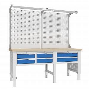 Регулировка рабочего места по высоте осуществляется в диапазоне от 700 до 950мм с шагом 25мм. Предусмотрена возможность тонкой регулировки усиленным резьбовым подпятником. Нагрузка на ящики верстака - до 40 кг, на полки - до 60кг. Общая распределенная нагрузка на рабочую поверхность 1500кг. Имеет возможность стыковки в единую рабочую поверхность с верстаками серии Constructor