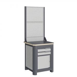 Экран (перфорированная панель) верстака выполнен с квадратной перфорацией 12х12 мм с шагом 38 мм для установки крючков, держателей и других аксессуаров. Экран крепятся к столешнице с помощью специальных кронштейнов. Максимальная масса груза, равномерно распределенного по поверхности экрана, составляет 71 кг.