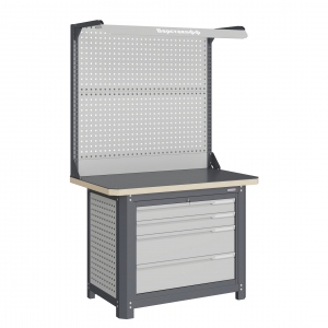 Экран (перфорированная панель) верстака выполнен с квадратной перфорацией 12х12 мм с шагом 38 мм для установки крючков, держателей и других аксессуаров. Экран крепятся к столешнице с помощью специальных кронштейнов. Максимальная масса груза, равномерно распределенного по поверхности экрана, составляет 71 кг.