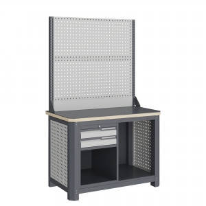 Экран (перфорированная панель) верстака выполнен с квадратной перфорацией 12х12 мм с шагом 38 мм для установки крючков, держателей и других аксессуаров. Экран крепятся к столешнице с помощью специальных кронштейнов. Максимальная масса груза, равномерно распределенного по поверхности экрана, составляет 71 кг.