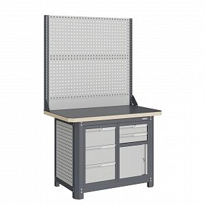 Экран (перфорированная панель) верстака выполнен с квадратной перфорацией 12х12 мм с шагом 38 мм для установки крючков, держателей и других аксессуаров. Экран крепятся к столешнице с помощью специальных кронштейнов. Максимальная масса груза, равномерно распределенного по поверхности экрана, составляет 71 кг.