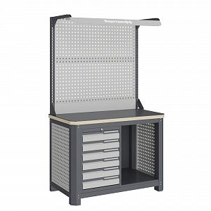 Экран (перфорированная панель) верстака выполнен с квадратной перфорацией 12х12 мм с шагом 38 мм для установки крючков, держателей и других аксессуаров. Экран крепятся к столешнице с помощью специальных кронштейнов. Максимальная масса груза, равномерно распределенного по поверхности экрана, составляет 71 кг.