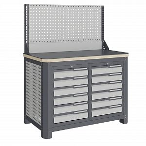 Экран (перфорированная панель) верстака выполнен с квадратной перфорацией 12х12 мм с шагом 38 мм для установки крючков, держателей и других аксессуаров. Экран крепятся к столешнице с помощью специальных кронштейнов. Максимальная масса груза, равномерно распределенного по поверхности экрана, составляет 71 кг.
