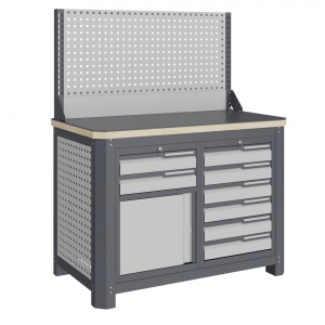 Экран (перфорированная панель) верстака выполнен с квадратной перфорацией 12х12 мм с шагом 38 мм для установки крючков, держателей и других аксессуаров. Экран крепятся к столешнице с помощью специальных кронштейнов. Максимальная масса груза, равномерно распределенного по поверхности экрана, составляет 71 кг.