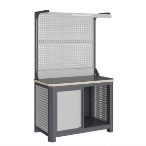 Экран (перфорированная панель) верстака выполнен с квадратной перфорацией 12х12 мм с шагом 38 мм для установки крючков, держателей и других аксессуаров. Экран крепятся к столешнице с помощью специальных кронштейнов. Максимальная масса груза, равномерно распределенного по поверхности экрана, составляет 71 кг.