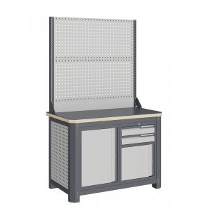 Экран (перфорированная панель) верстака выполнен с квадратной перфорацией 12х12 мм с шагом 38 мм для установки крючков, держателей и других аксессуаров. Экран крепятся к столешнице с помощью специальных кронштейнов. Максимальная масса груза, равномерно распределенного по поверхности экрана, составляет 71 кг.
