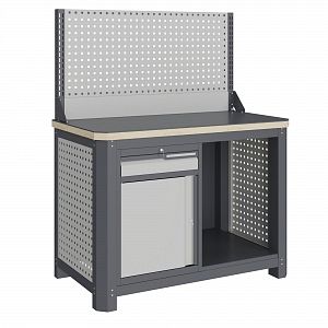 Экран (перфорированная панель) верстака выполнен с квадратной перфорацией 12х12 мм с шагом 38 мм для установки крючков, держателей и других аксессуаров. Экран крепятся к столешнице с помощью специальных кронштейнов. Максимальная масса груза, равномерно распределенного по поверхности экрана, составляет 71 кг.