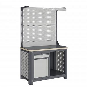 Экран (перфорированная панель) верстака выполнен с квадратной перфорацией 12х12 мм с шагом 38 мм для установки крючков, держателей и других аксессуаров. Экран крепятся к столешнице с помощью специальных кронштейнов. Максимальная масса груза, равномерно распределенного по поверхности экрана, составляет 71 кг.