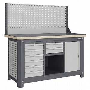 Экран (перфорированная панель) верстака выполнен с квадратной перфорацией 12х12 мм с шагом 38 мм для установки крючков, держателей и других аксессуаров. Экран крепятся к столешнице с помощью специальных кронштейнов. Максимальная масса груза, равномерно распределенного по поверхности экрана, составляет 71 кг.