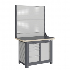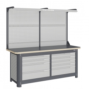 Экран (перфорированная панель) верстака выполнен с квадратной перфорацией 12х12 мм с шагом 38 мм для установки крючков, держателей и других аксессуаров. Экран крепятся к столешнице с помощью специальных кронштейнов. Максимальная масса груза, равномерно распределенного по поверхности экрана, составляет 71 кг.
