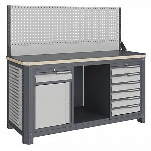 Экран (перфорированная панель) верстака выполнен с квадратной перфорацией 12х12 мм с шагом 38 мм для установки крючков, держателей и других аксессуаров. Экран крепятся к столешнице с помощью специальных кронштейнов. Максимальная масса груза, равномерно распределенного по поверхности экрана, составляет 71 кг.