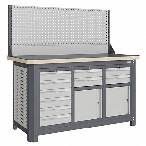 Экран (перфорированная панель) верстака выполнен с квадратной перфорацией 12х12 мм с шагом 38 мм для установки крючков, держателей и других аксессуаров. Экран крепятся к столешнице с помощью специальных кронштейнов. Максимальная масса груза, равномерно распределенного по поверхности экрана, составляет 71 кг.