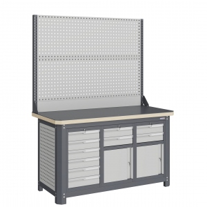 Экран (перфорированная панель) верстака выполнен с квадратной перфорацией 12х12 мм с шагом 38 мм для установки крючков, держателей и других аксессуаров. Экран крепятся к столешнице с помощью специальных кронштейнов. Максимальная масса груза, равномерно распределенного по поверхности экрана, составляет 71 кг.