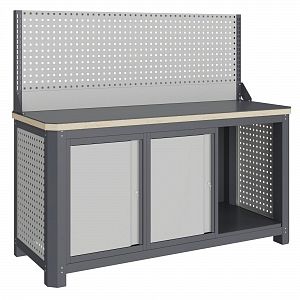 Экран (перфорированная панель) верстака выполнен с квадратной перфорацией 12х12 мм с шагом 38 мм для установки крючков, держателей и других аксессуаров. Экран крепятся к столешнице с помощью специальных кронштейнов. Максимальная масса груза, равномерно распределенного по поверхности экрана, составляет 71 кг.