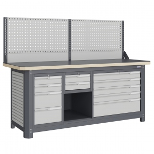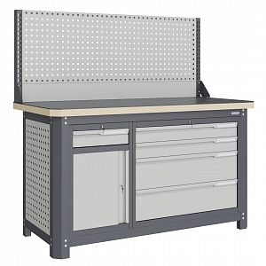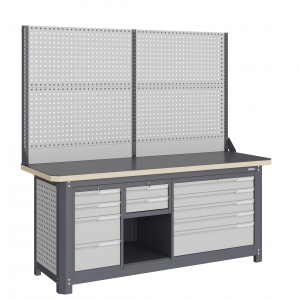 Экран (перфорированная панель) верстака выполнен с квадратной перфорацией 12х12 мм с шагом 38 мм для установки крючков, держателей и других аксессуаров. Экран крепятся к столешнице с помощью специальных кронштейнов. Максимальная масса груза, равномерно распределенного по поверхности экрана, составляет 71 кг.