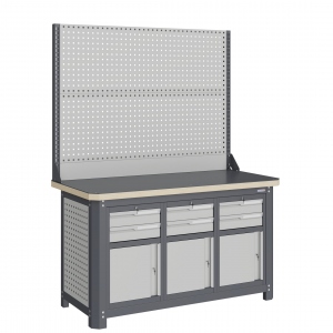 Экран (перфорированная панель) верстака выполнен с квадратной перфорацией 12х12 мм с шагом 38 мм для установки крючков, держателей и других аксессуаров. Экран крепятся к столешнице с помощью специальных кронштейнов. Максимальная масса груза, равномерно распределенного по поверхности экрана, составляет 71 кг.