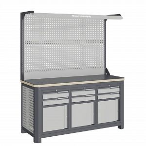 Верстак серии MECHANIC: MCN 1552.S999-2F состоит из столешницы шириной 1493 мм, рамы верстака, состоящей из опор, перемычек, боковых перфопанелей, трех малых модулей S9, двойного экрана с кронштейнами и комплектом освещения.