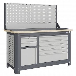 Экран (перфорированная панель) верстака выполнен с квадратной перфорацией 12х12 мм с шагом 38 мм для установки крючков, держателей и других аксессуаров. Экран крепятся к столешнице с помощью специальных кронштейнов. Максимальная масса груза, равномерно распределенного по поверхности экрана, составляет 71 кг.