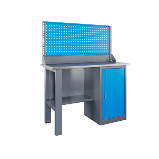 Верстак серии Technic 121.17.1-1 состоит из столешницы шириной 1196 мм, опоры, тумбы P7 с дверью, полки-стенки и одинарного экрана с кронштейнами.