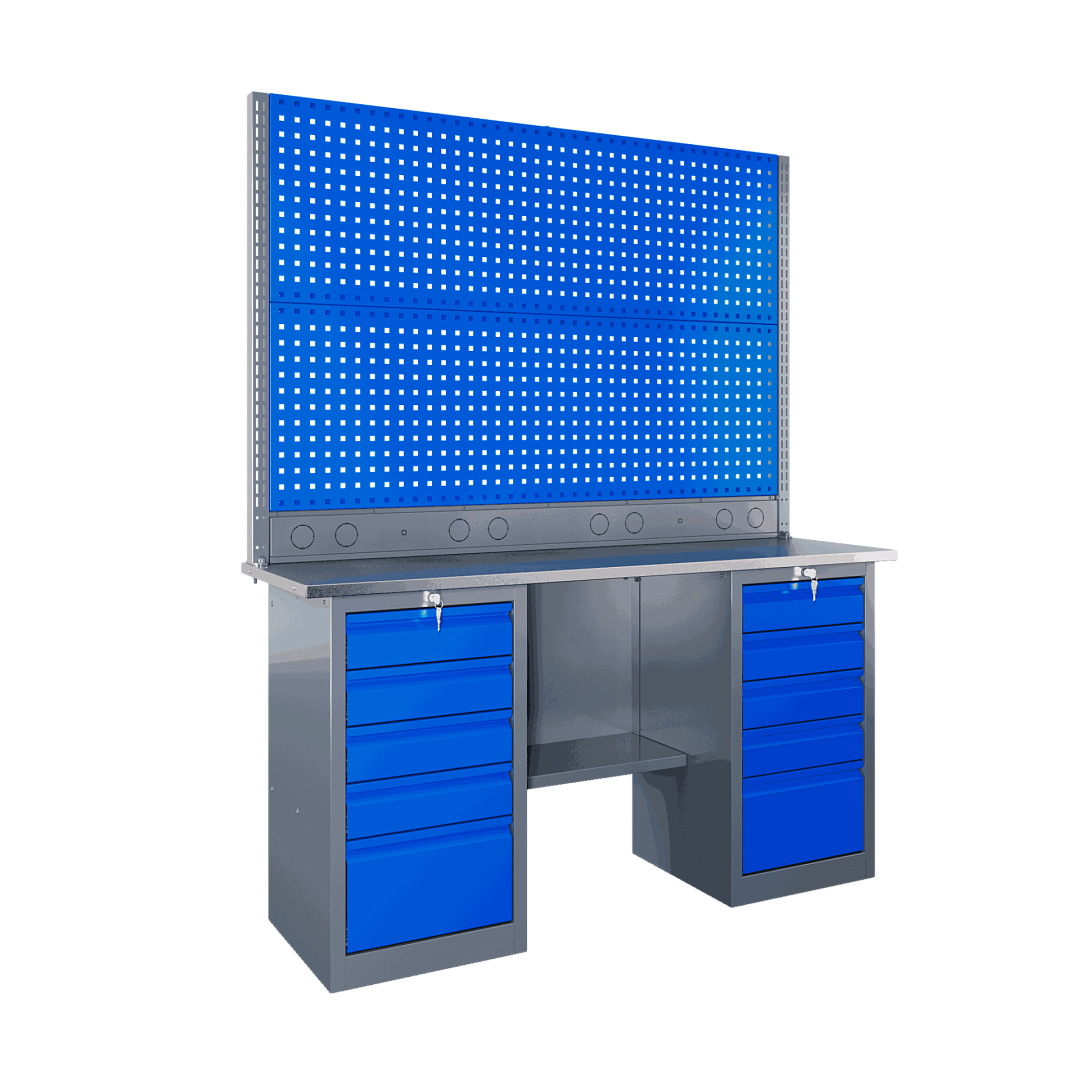 Самые компактные верстаки с глубиной столешницы 500 мм. Благодаря небольшой глубине, такие верстаки легко размещаются в ограниченных пространствах, например, в гаражах, мастерских и тд. Несмотря на компактные размеры, верстаки могут быть оснащены полками, ящиками и держателями для инструментов, что помогает поддерживать порядок и быстро находить нужные предметы.